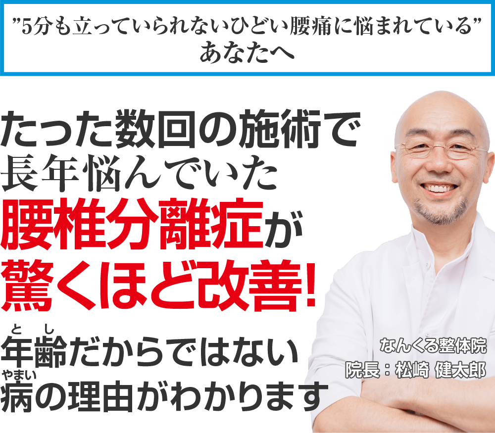 もしあなたが、上記の様にお悩みがあり、心の奥で「痛みで悲しい気持ちを我慢しているけど少しでも良くなりたい!」と思われているならなんくる整体院に来院し、杖を使わないと歩けないような腰椎分離症を改善しませんか?ということです。