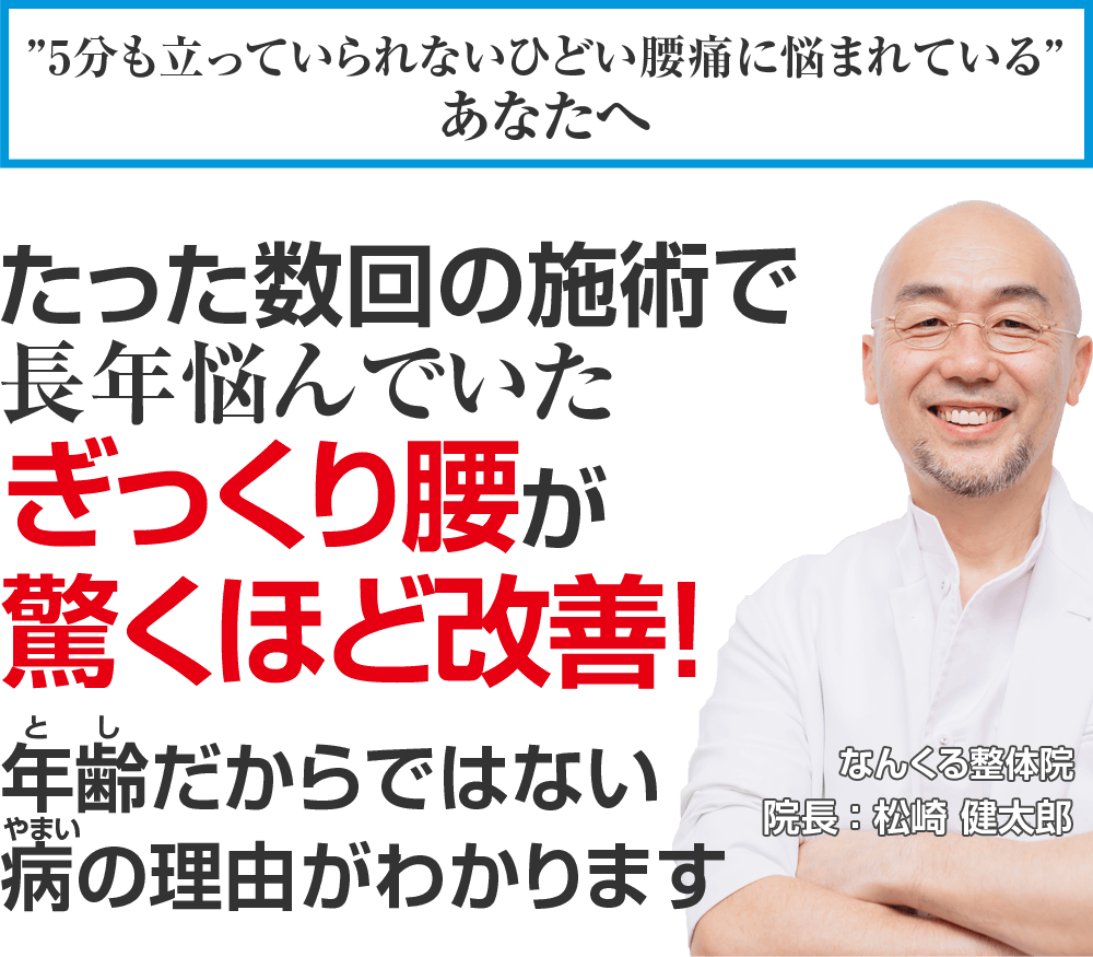 - 3箇所以上の整体院に通ってみたが、ぎっくり腰が改善する気配がない。